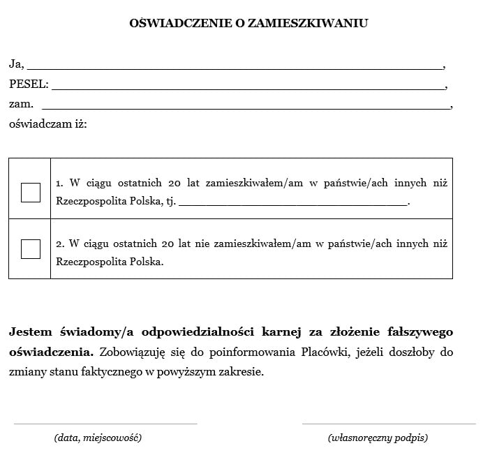 Jeżeli w powyższym oświadczeniu, lekarz zaznaczy pkt 1 (w ciągu ostatnich 20 lat zamieszkiwał w państwie innym niż RP), to dodatkowo ma obowiązek przedłożenia pracodawcy: